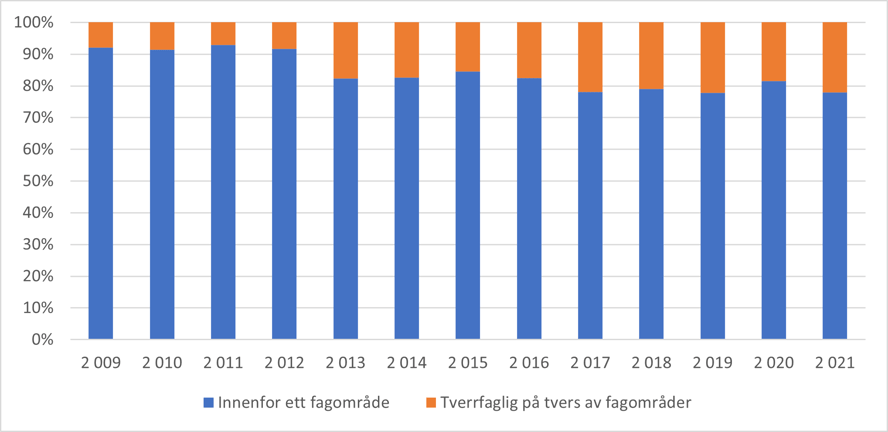 Omtrent 20 prosent av prosentvis budsjettfordeling for polarporteføljen tilhørende prosjekter som er tverrfaglige på tvers av fagområder. Det er en del mindre tverrfaglighet på tvers av fagområder for polarporteføljen enn for klimaporteføljen. Tidligere ble fagkodemerkingen av prosjektene gjort av Forskningsrådets administrasjon, men har de siste årene blitt gjort av søkerne i forbindelse med innsending av søknaden, men uten mulighet for å hake av for tverr-/flerfaglighet for ulike fagområder. Fordi det er søkerne selv som nå merker sitt prosjekt med ulike fagdisipliner/fagområder, er det grunn til å tro at tverrfagligheten kommer mer nøyaktig fram nå enn i eldre prosjekter. Av figur 27 nedenfor ser det ut til at tverrfagligheten i prosjekter har økt, men (deler av) økningen kan også skyldes endringer i hvem som merker.