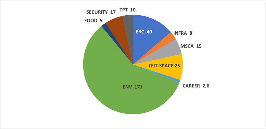 Endelige tall for tildelinger fra Horisont 2020, EUs åttende rammeprogram for forskning og innovasjon, viser at norske søkere har mottatt i underkant av 300 mill. kroner til polarforskning (figur 22). Dominerende er programområdet Samfunnsutfordringer med delprogrammet Klima, miljø, ressurser, effektivitet og råmaterialer (171 mill. kroner) som bidro med mer enn halvparten av totalbeløpet og delprogrammet Det europeiske forskningsrådet (40 mill. kroner). Videre bidro programområdet Industrielt lederskap med delprogrammet Romfart til 25 mill. kroner. Sammenligner vi disse tallene med hva norsk klimaforskning har hentet fra Horisont 2020 så er det noen interessant tall å merke seg. Begge forskningsområdene hentet mer enn halvparten av finansieringen fra delprogrammet Klima, miljø, ressurser, effektivitet og råmaterialer, mens polarforskningen relativt sett hentet en mye større andel fra Romfart, Security og MSCA aktiviteter, mens klimaforskningen hentet en større andel fra FOOD: Matsikkerhet, land- og skogbruk, marin forskning, bioøkonomi.