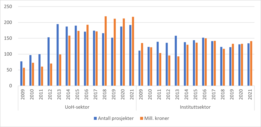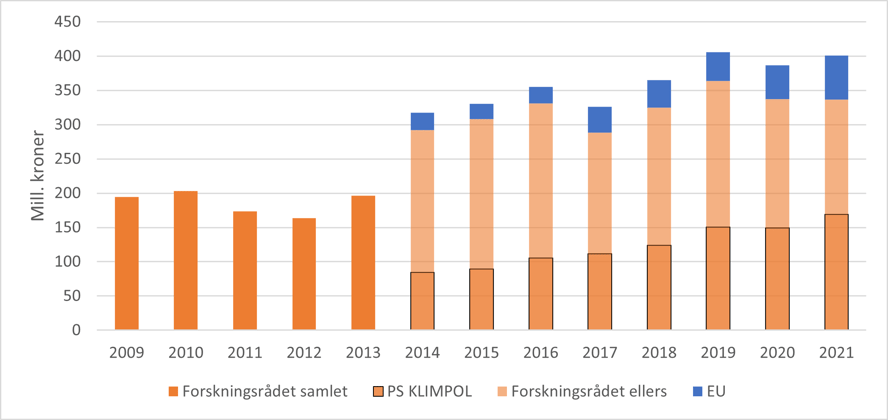 Forskningsrådets totale polarportefølje var i 2021 på 401 mill. kroner. Dette inkluderer finansieringen gjennom Forskningsrådet og EU på henholdsvis 336 og 64 mill. kroner (figur 21). Polarporteføljen er omtrent halvparten så stor som klimaporteføljen, både i budsjett og antall prosjekter. I perioden 2009-2021 har finansiering av polarprosjekter fra Forskningsrådet økt fra 195 til 336 mill. kroner. Dersom vi tar hensyn til konsumprisindeksen, vil 195 mill. kroner i 2009 tilsvare 252 mill. kroner i 2021, så det har vært en reell økning fra Forskningsrådet til polarforskning i perioden.