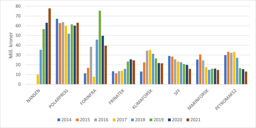 Arven etter Nansen (AeN) ble startet i 2018, men med finansiering av et forprosjekt i 2017. Prosjektet er i 2021 budsjettformålet som bidrar mest til polarporteføljen med 78 mill. kroner som er omtrent 15 mill. kroner mer enn i 2020. Økningen skyldes primært ikke planlagt økt aktivitet, men er av mer administrativ art, bl.a. utsettelser som følge av koronapandemien. AeN avsluttes i 2024 etter at prosjektet har fått 6 måneders utsettelse. Dersom det ikke følges opp med et annet, stort initiativ vil totalfinansieringen av polarforskningen reduseres merkbart. Videre vil andelen marinbiologi i polarforskningen reduseres, men det vil ikke synes på statistikken fordi prosjektet er merket i helhet som tverrfaglig. POLARPROG er det budsjettformålet som i perioden 2009-2021 bidrar med den største finansieringen og det bidraget varierer relativt lite over perioden. KLIMAFORSKs årlige bidrag til polarforskningen har variert 13-35 mill. kroner per år. Bidraget økte i starten av perioden, men har siden 2017 sunket.