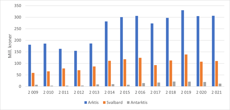 Porteføljestyrets budsjettformål stod i 2014 for 85 mill. kroner til polarporteføljen, og det økte til 169 mill. kroner i 2021. EUs bidrag til polarporteføljen har fra 2014 til 2021 mer enn doblet seg fra 25 mill. kroner i 2014 til 64 mill. kroner i 2021 og utgjør 15 prosent av polarporteføljen.