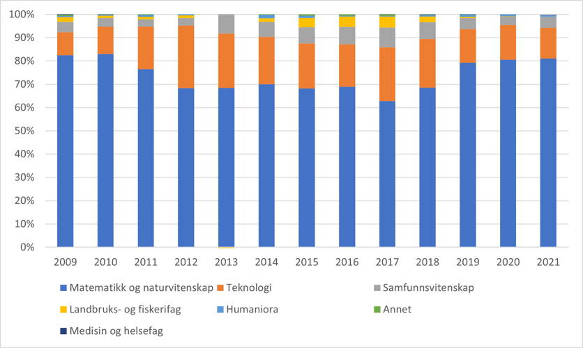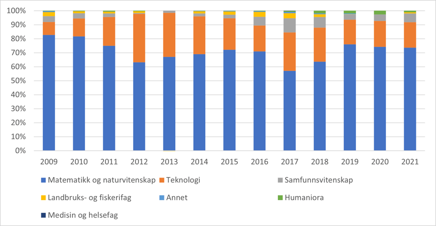 Polarporteføljen domineres av matematisk-naturvitenskapelige fag. Disse hadde i 2021 en andel på 81 prosent, mens teknologi hadde en andel på 13 prosent og samfunnsvitenskap 5 prosent (figur 26). Gjennom hele perioden fra 2009 har matnat-fagene dominert polarporteføljen, og fordelingen mellom fagområdene har vært nokså jevn, men med noe nedgang for matnat-fagene og økning for teknologifagene midt i perioden. Samfunnsfagene har hatt en andel på 3-8 prosent av polarporteføljen.