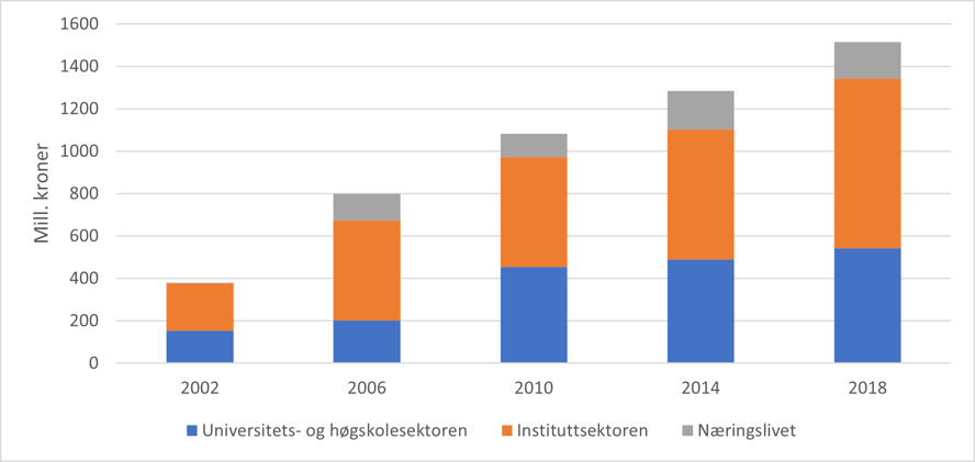 Det ble sist gang i 2018 gjennomført en kartlegging av norsk polarforskning inkludert blant annet antall forskere, årsverk og finansiering (NIFU 2019:24). Figur 20 viser at det siden 2002 har vært en økning i finansieringen av polarforskningsprosjekter og at i 2018 var den totale finansieringen på ca. 1,5 mrd. kroner. Instituttsektoren og Universitets- og høgskolesektoren er de dominerende sektorene, mens næringslivet har en relativt mindre andel av polarporteføljen enn av klimaporteføljen. Denne kartleggingen viste også at nærmere 93 prosent av ressursene brukes i Arktis og omtrent 7 prosent brukes i Antarktis.