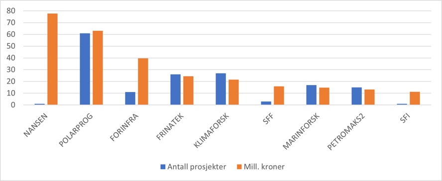 Av de største bidragsyterne til polarporteføljen er trenden fra KLIMAFORSK variabel i perioden 2014-2021 med en økning de første årene for så å redusere bidraget betydelig de siste årene. Samlet i hele perioden er det en økning fra KLIMAFORSK til polarporteføljen. Senter for Fremragende Forskning (SFF) viser nedadgående trend for finansiering av polarforskning, mens FRINATEK som finansierer søknader under Fri prosjektstøtte (dvs. ikke-tematiske utlysninger) har i perioden økt finansieringen av polare forskningsprosjekter.